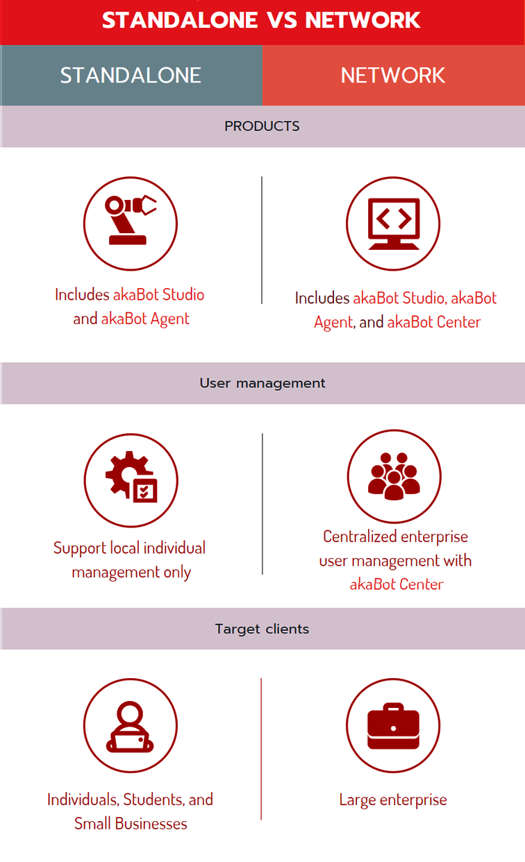 - The standalone edition is suitable for Individuals, Students, and Small Businesses with small-scaled projects that can be run locally on one device. It includes akaBot Studio and akaBot Agent only.
