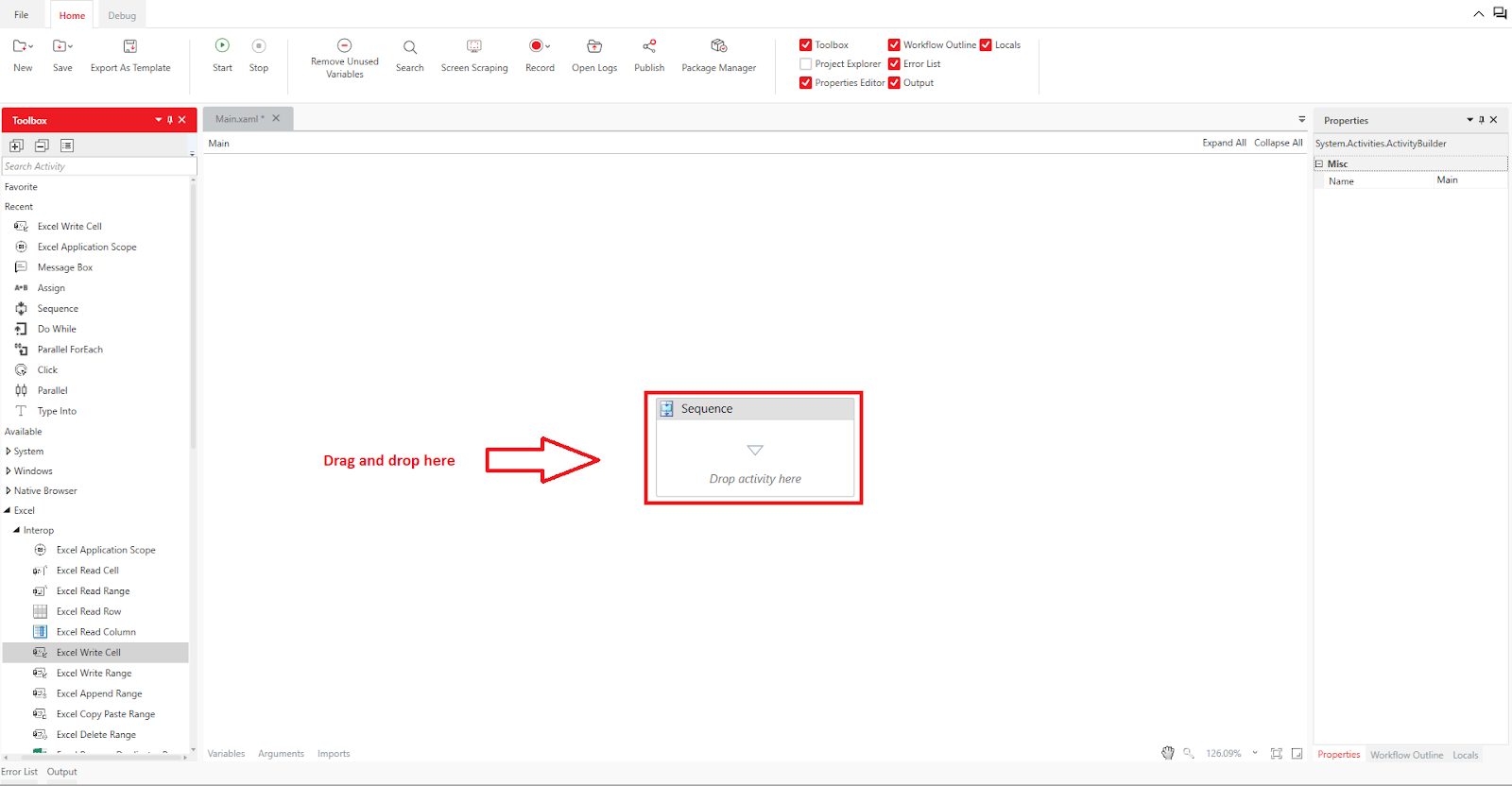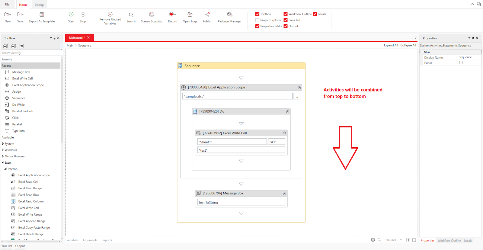 If you want to combine multiple activities within the sequence, drag and drop the desired activities into the sequence. Place subsequent activities below the previously placed ones, creating a flow from top to bottom as you build the process.