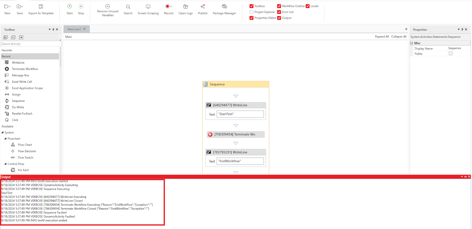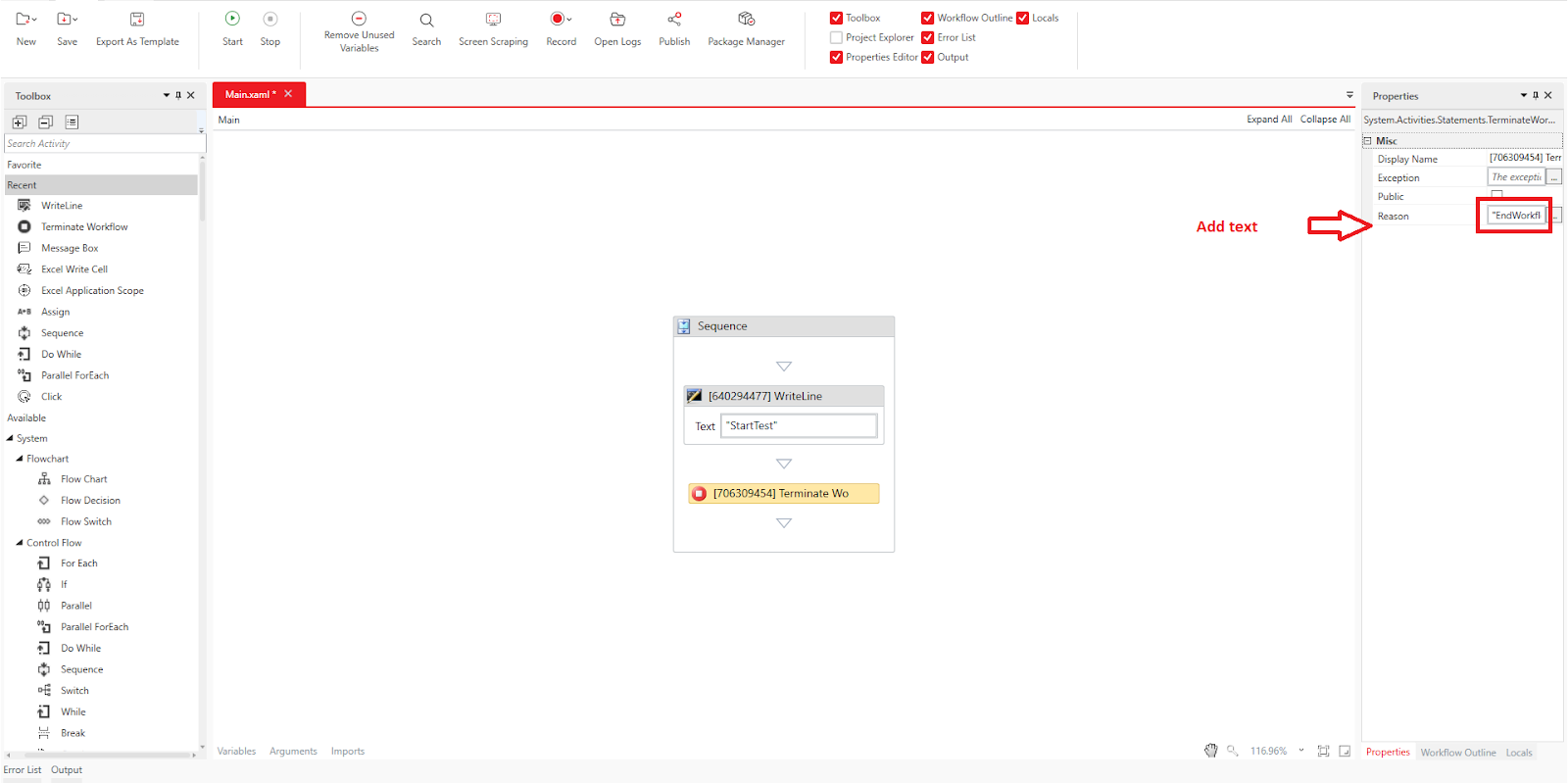 Since the second Write Line activity is not executed, there will be no entry for "Test End". Also, confirm that in the "Reason" field, the value "EndTest" is displayed, which was set in the "Reason" property of the Terminate Workflow activity.
