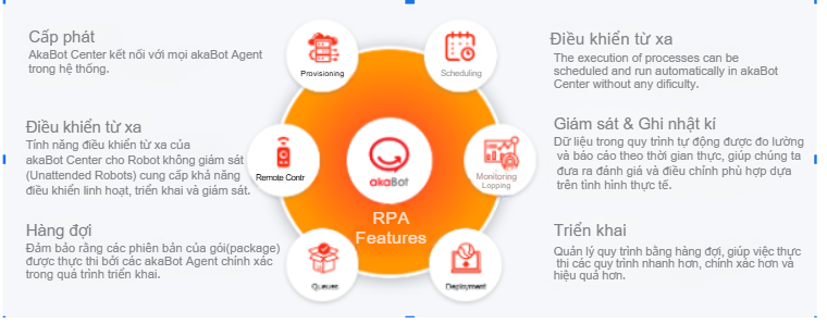AkaBot Center đảm bảo việc quản lý tập trung và phân phối chính xác các phiên bản gói (package) đến bot để thực thi, đồng thời hỗ trợ lên lịch hoặc chạy ngay lập tức thông qua cơ chế kích hoạt (trigger). Nó còn có khả năng phân phối khối lượng công việc đến các bot không giám sát (unattended bots), và khi được cho phép phân phối công việc động, hệ thống có thể tối đa hóa hiệu suất và tối ưu việc sử dụng bot.