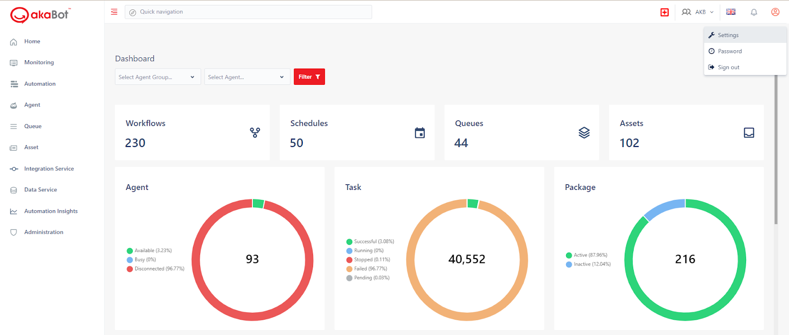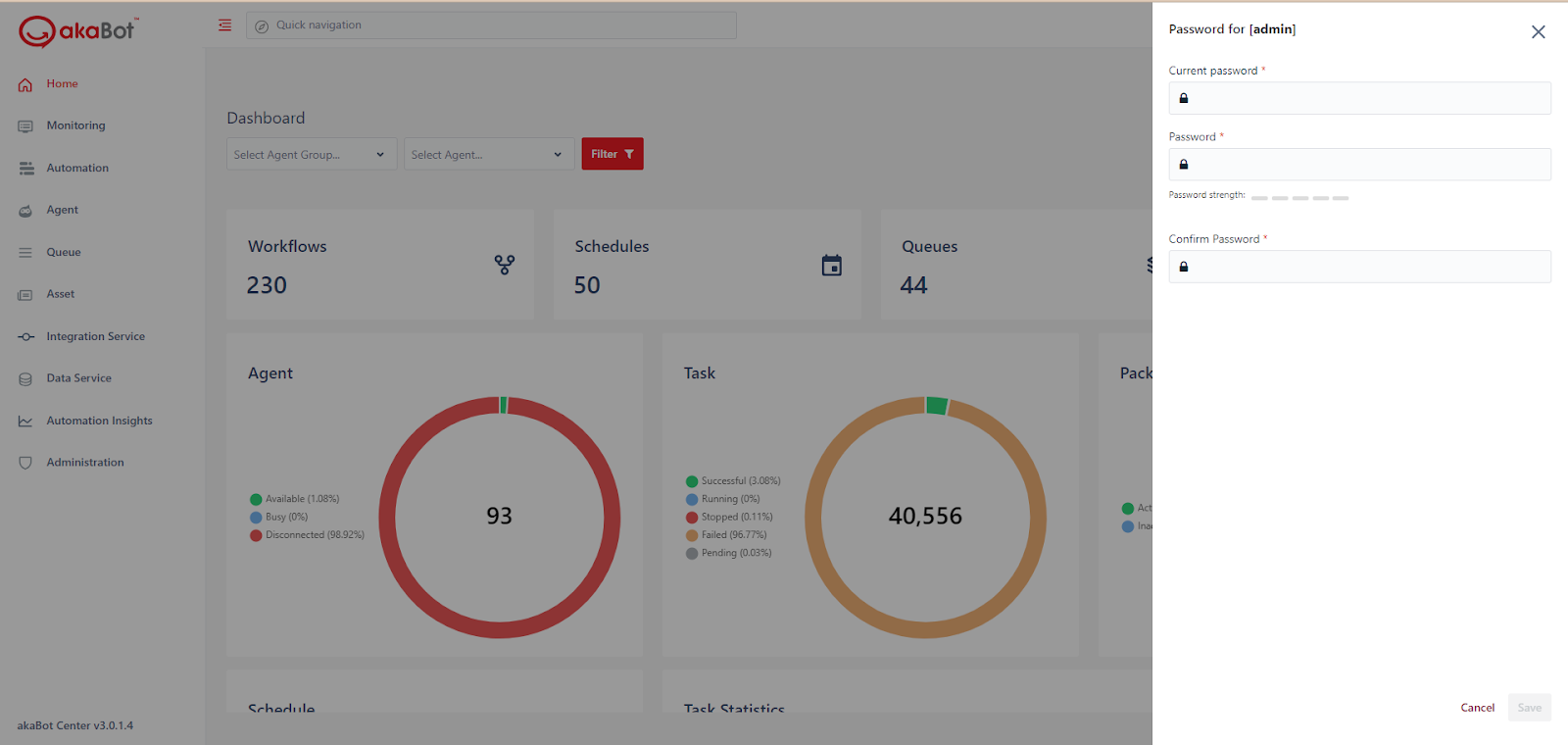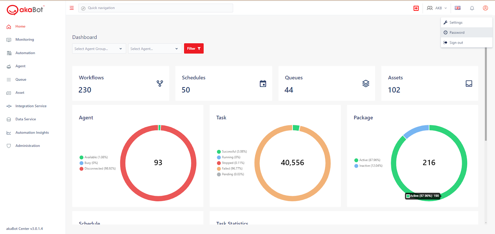 Sau khi đăng nhập vào AkaBot Center, nhấp vào biểu tượng tài khoản ở góc trên bên phải màn hình và chọn "Password" (Mật khẩu) từ menu thả xuống.