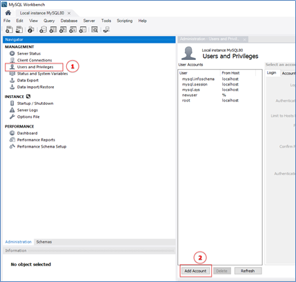 - Truy cập chức năng “Users and Privileges” ở bảng bên trái (1).
