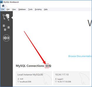 - Mở MySQL Workbench trên máy tính khác, nhấp nút Add Connection (xem hình bên dưới)