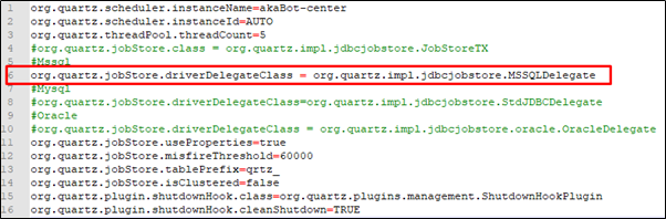 Bỏ ký tự “#” ở phần cấu hình jobstore cho MSSQL để kích hoạt.