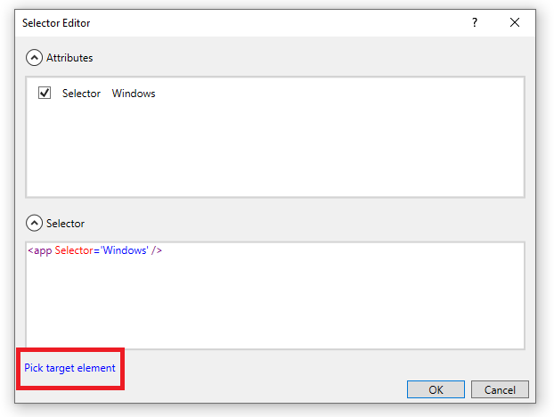 Trên màn hình “Selector Editor” hiển thị, nhấn “Pick target element”.