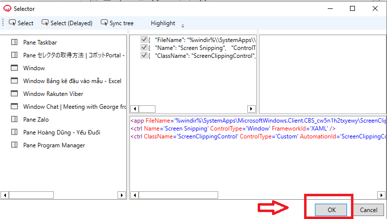 Sau khi xác định phần tử, màn hình “Selector” sẽ hiển thị lại, cho phép bạn kiểm tra phần tử đã chọn.Nếu không cần chỉnh sửa selector, nhấn nút “OK”.