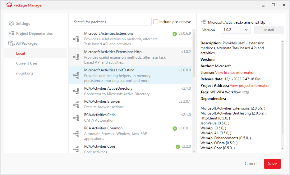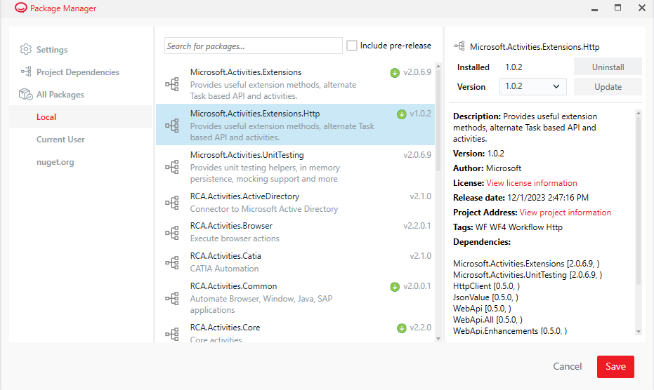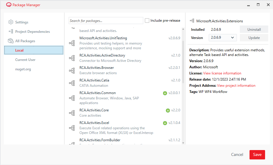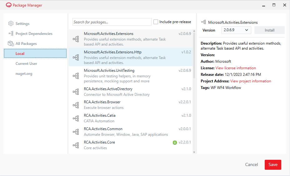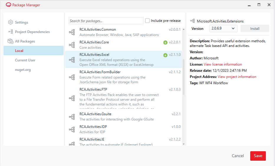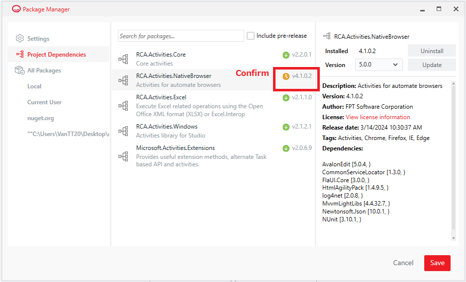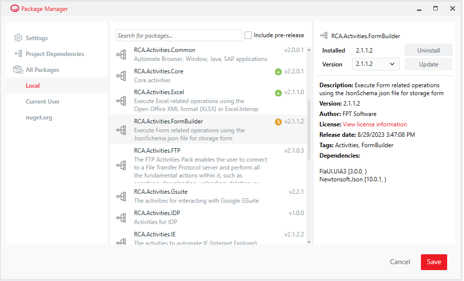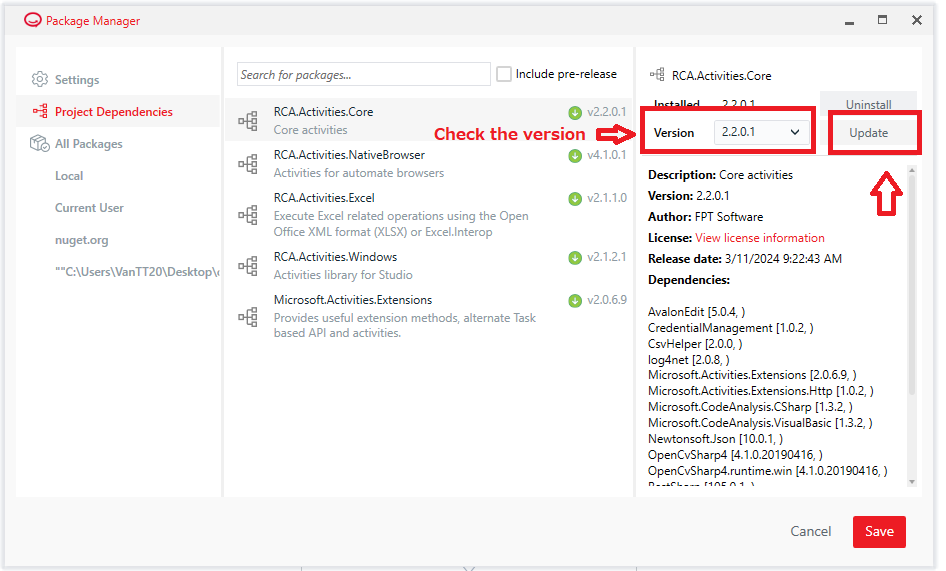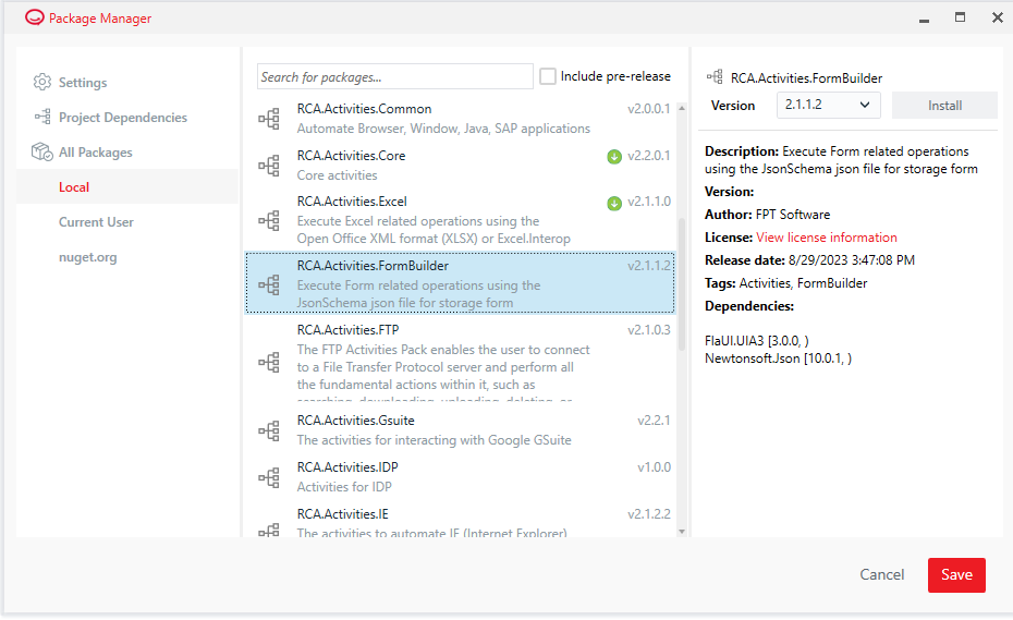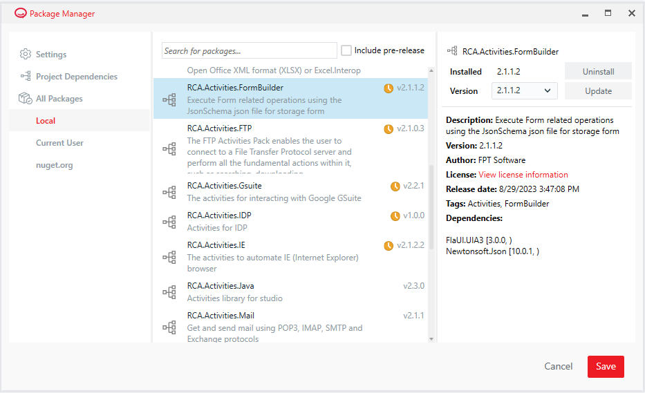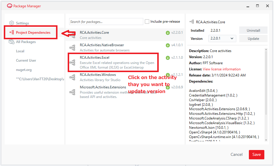 Mở “Package Manager” trong AkaBot Studio và chọn tên hoạt động mà bạn muốn cập nhật phiên bản.