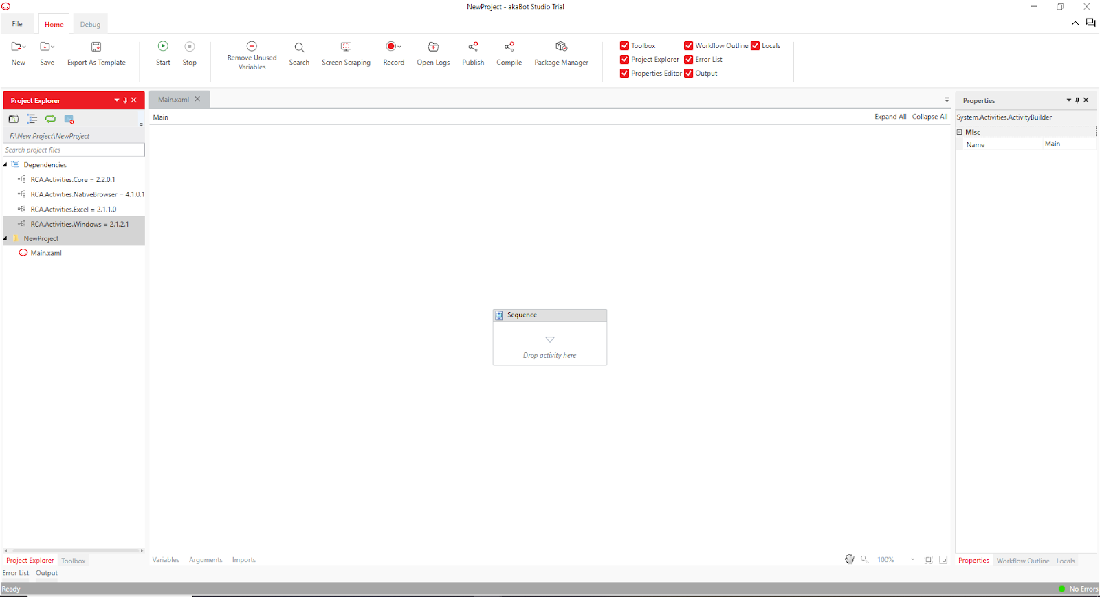 AkaBot Studio sẽ khởi động. Hãy kiểm tra để đảm bảo rằng hoạt động vừa thêm được hiển thị trong Project Explorer và Toolbox.