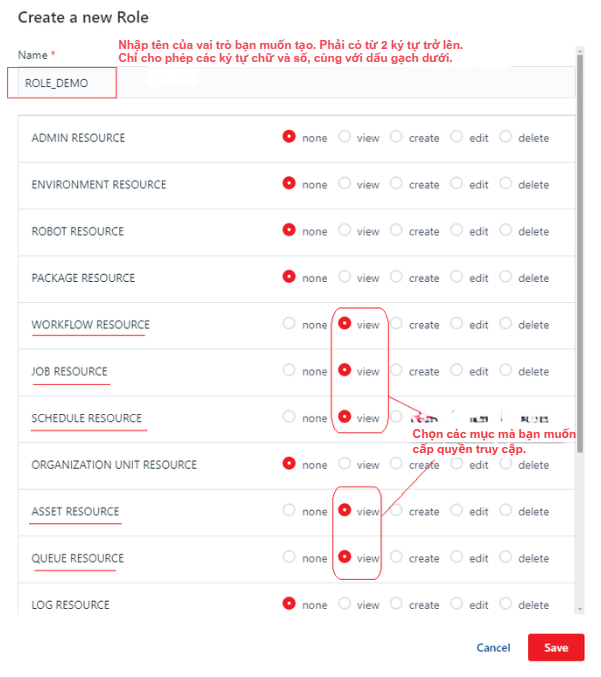 Hãy cùng xem cách tạo một vai trò thông qua ví dụ về “vai trò có quyền xem (view) đối với các tài nguyên Workflow, Job, Schedule, Asset và Queue, và không có quyền đối với các tài nguyên khác.”