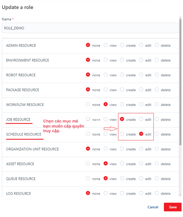 Để minh họa cách chỉnh sửa vai trò, hãy lấy ví dụ chỉnh sửa vai trò “ROLE_DEMO” để cho phép thêm tác vụ và thực thi lịch biểu (schedule) thủ công.
