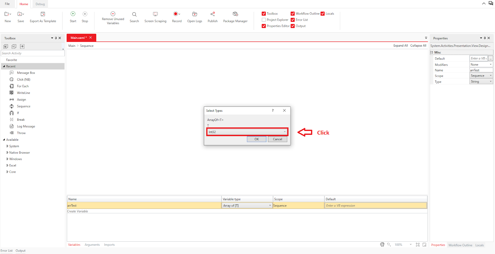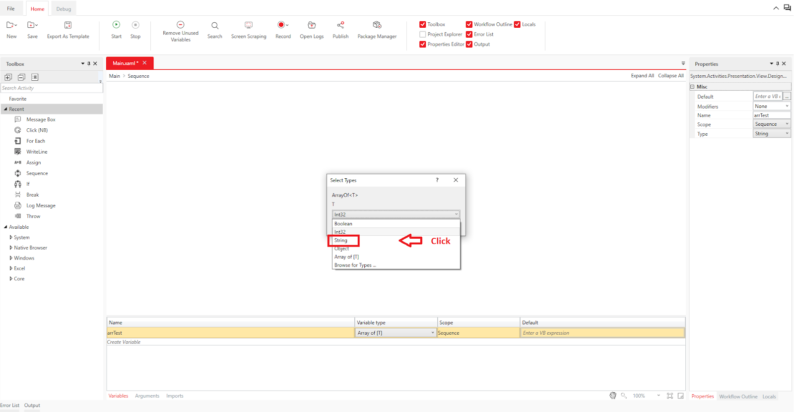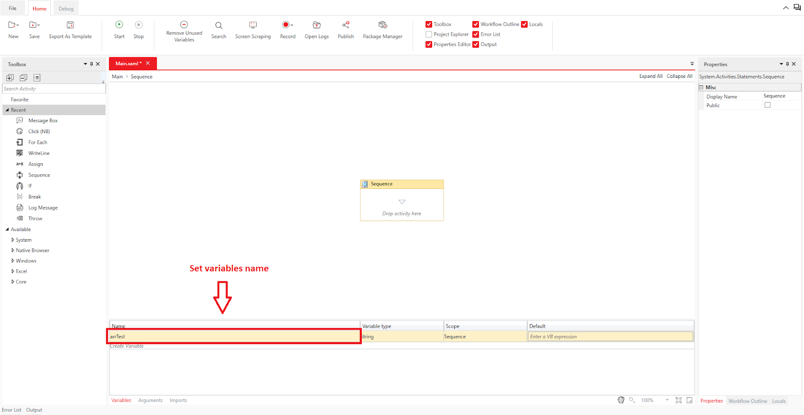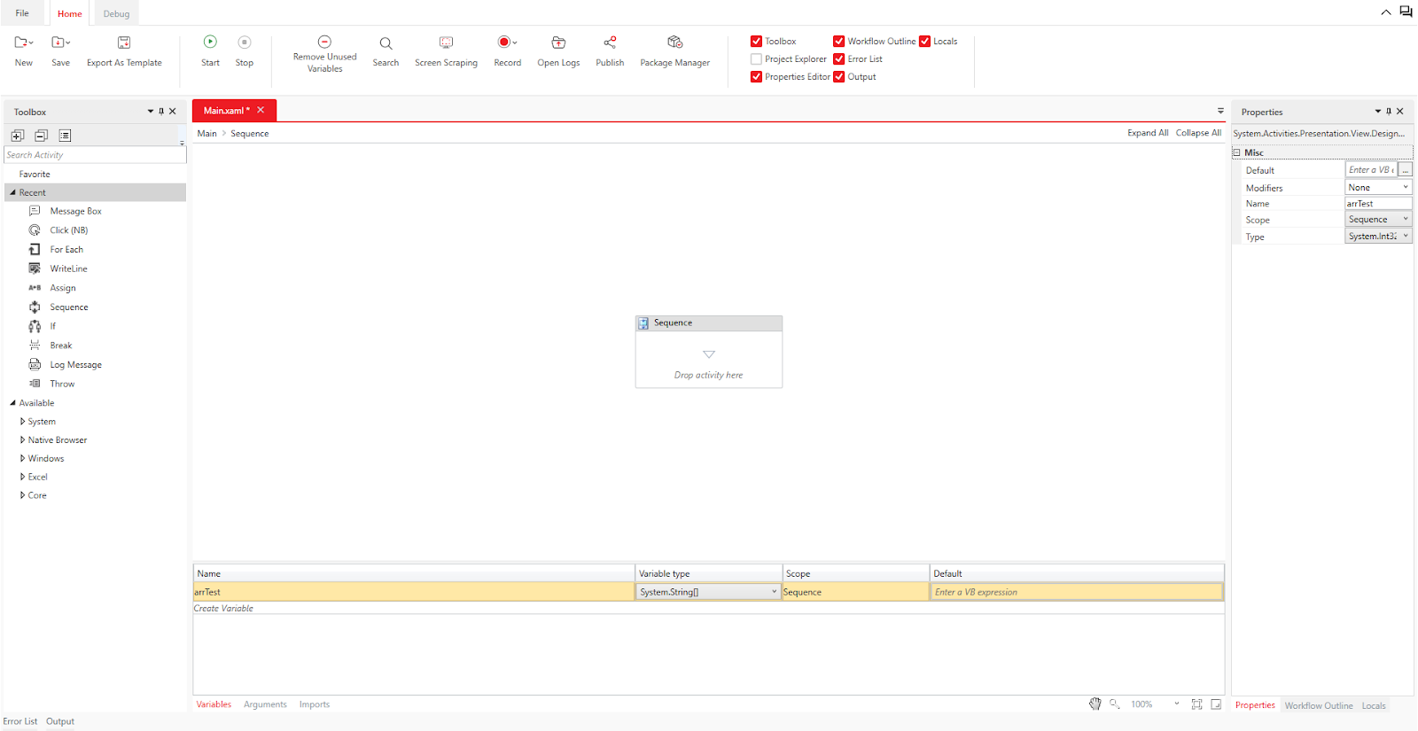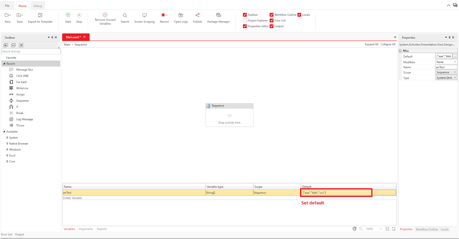 Đối với biến arrTest đã tạo trước đó, hãy nhập: {"aaa", "bbb", "ccc"} trong phần Default value của bảng Variables.