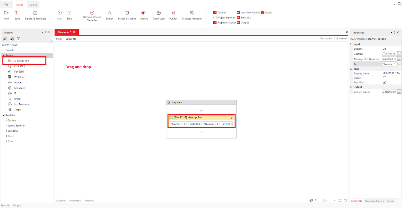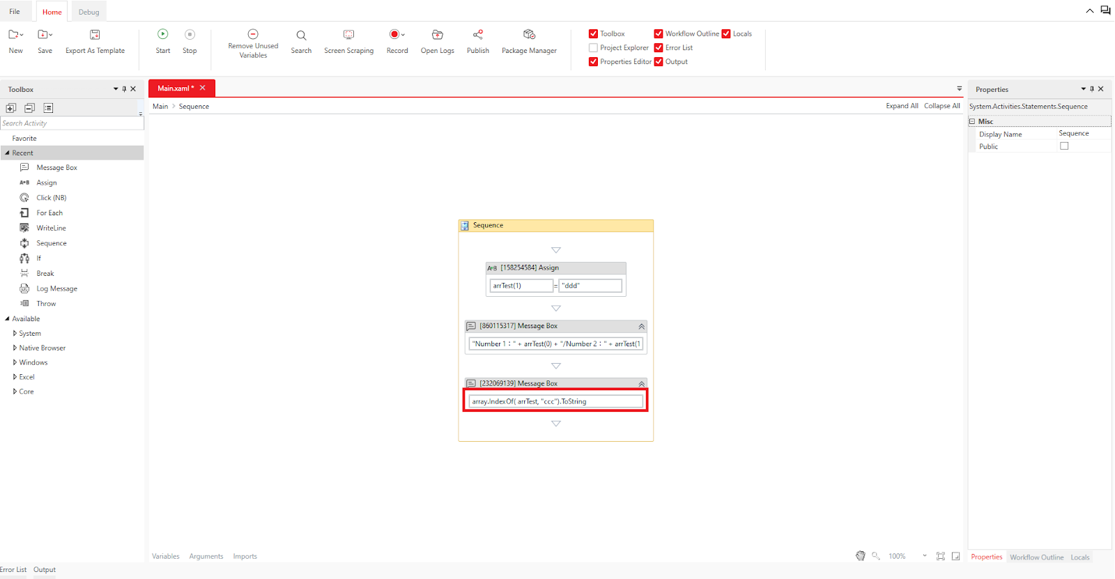Tiếp theo, đặt một activity "Message Box" và gán giá trị sau vào thuộc tính "Text" để kiểm tra chỉ số mà giá trị "ccc" được lưu trong mảng.