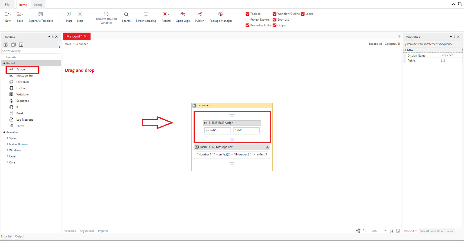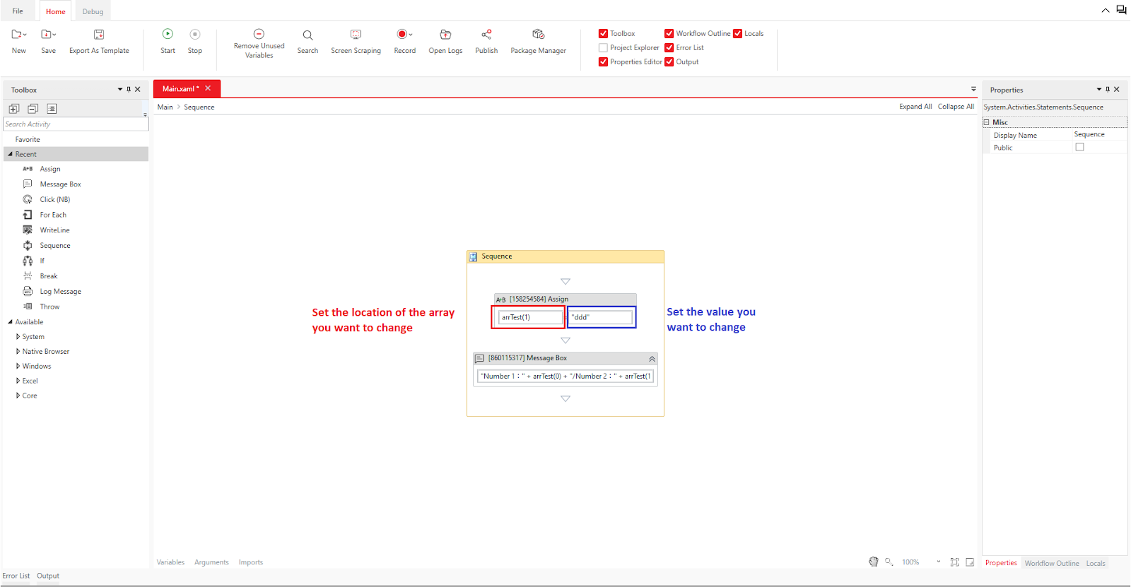Như hình minh họa tiếp theo, hãy đặt phía bên trái của hoạt động Assign là vị trí trong mảng mà bạn muốn thay đổi, và phía bên phải là giá trị bạn muốn gán. Ở đây, đặt bên trái là arrTest(1) và bên phải là "ddd".
