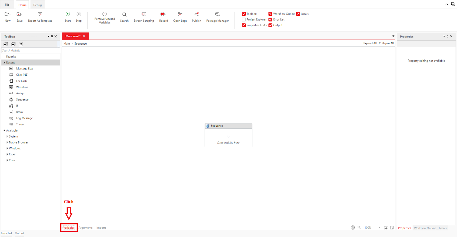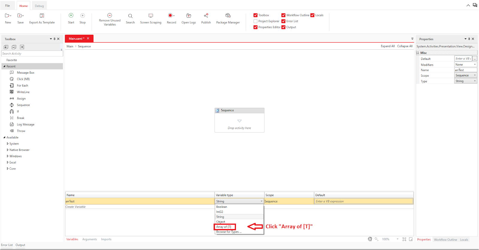 Bằng cách đặt giá trị như {"ValueA", "ValueB", "ValueC", "ValueD", "ValueE"} trong phần Default value của bảng Variables, bạn có thể gán giá trị khởi tạo cho mảng.