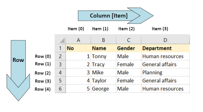 - Cột (Item) được đánh số 0, 1, 2,… hoặc xác định bằng tên cột (header) thay vì A, B, C…