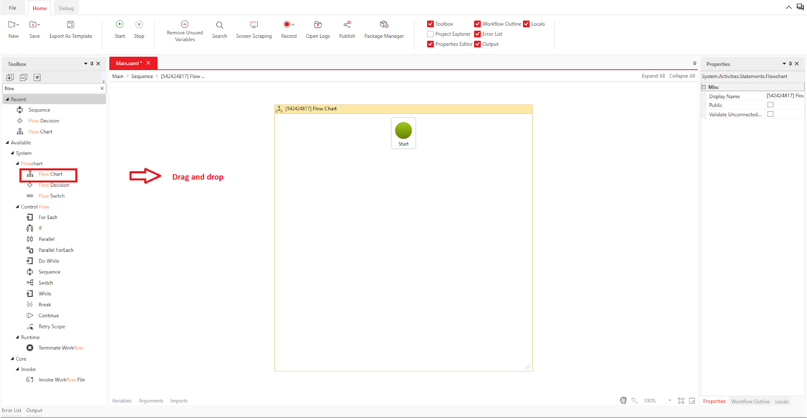 Để sử dụng Flowchart, hãy kéo và thả (drag and drop) nó từ Activity Panel sang Designer Panel.