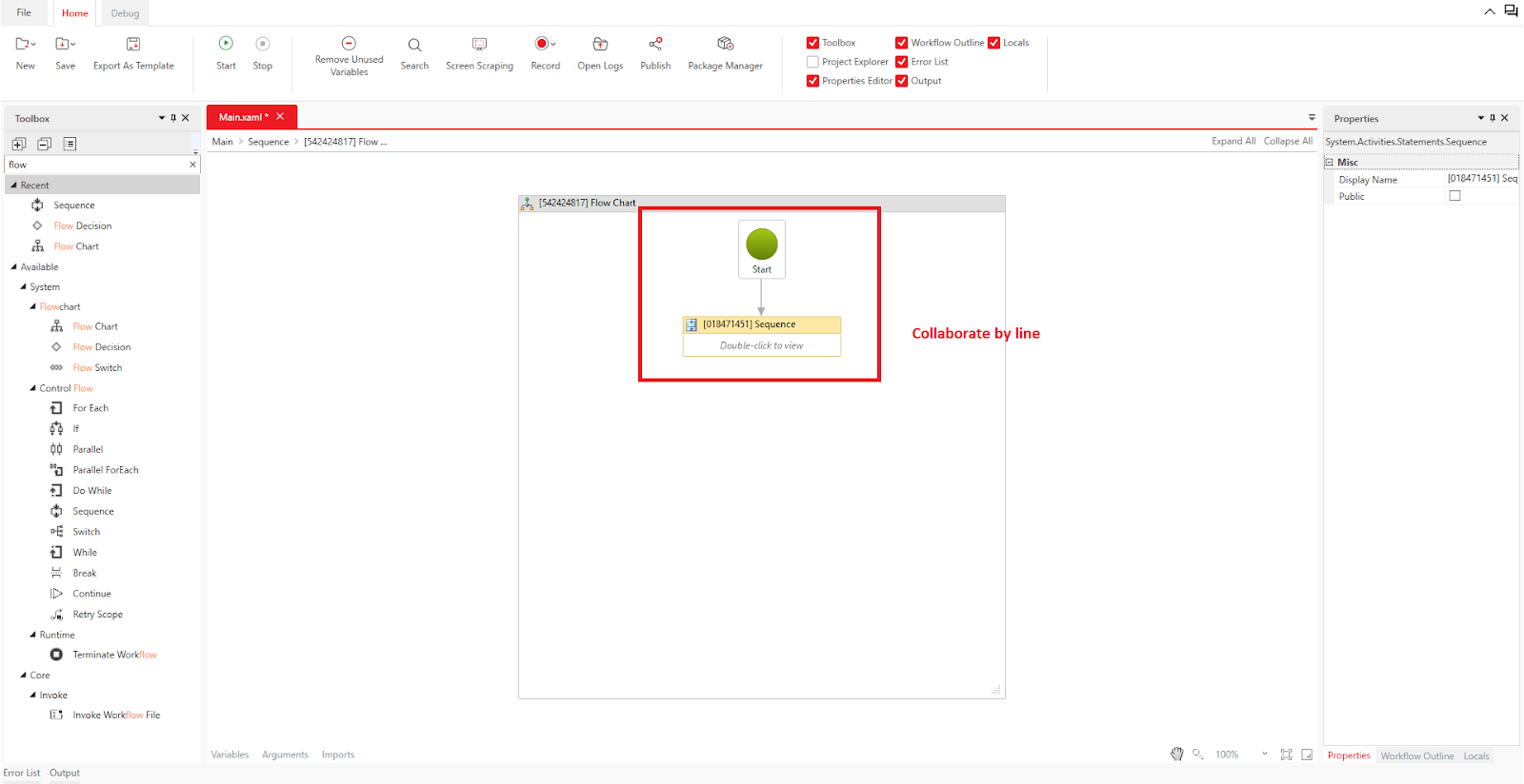 Khi bạn muốn đặt các activity hoặc sequence mục tiêu vào trong flowchart để tạo một workflow, hãy di chuyển con trỏ chuột đến “Start” trong flowchart. Bạn sẽ thấy các dấu vuông nhỏ xuất hiện ở phía trên, dưới, trái và phải. Bằng cách nhấp và kéo các dấu vuông này đến activity hoặc sequence mà bạn muốn bắt đầu, bạn có thể kết nối chúng bằng một đường thẳng.