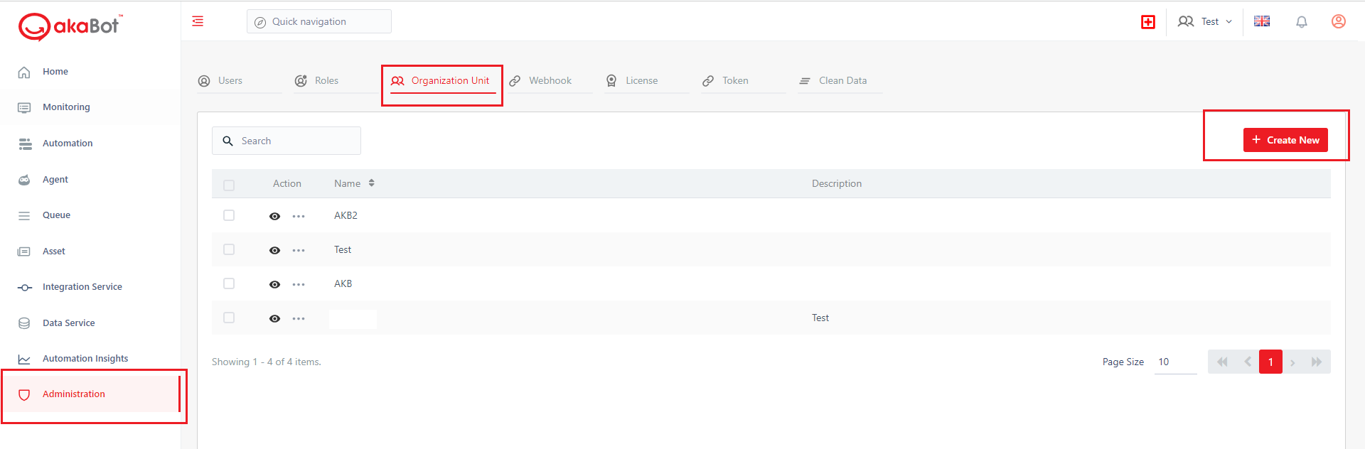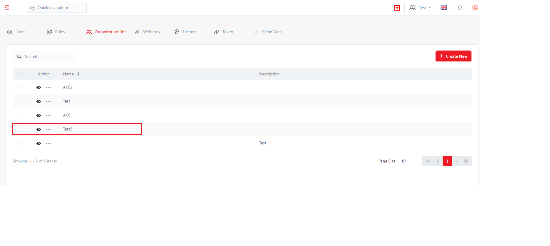1. Truy cập vào mục “Organization Unite” trong menu “Administration”, sau đó nhấp vào nút “Create New”.