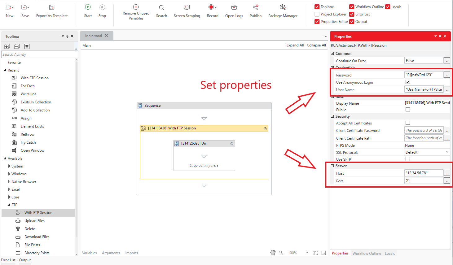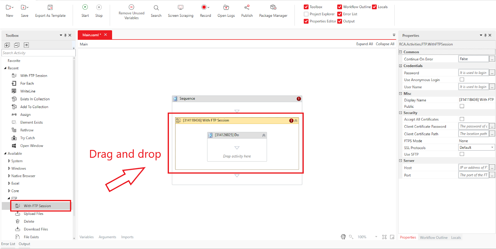 1. Kéo hoạt động “With FTP Session” từ mục “FTP” vào bảng Designer.
