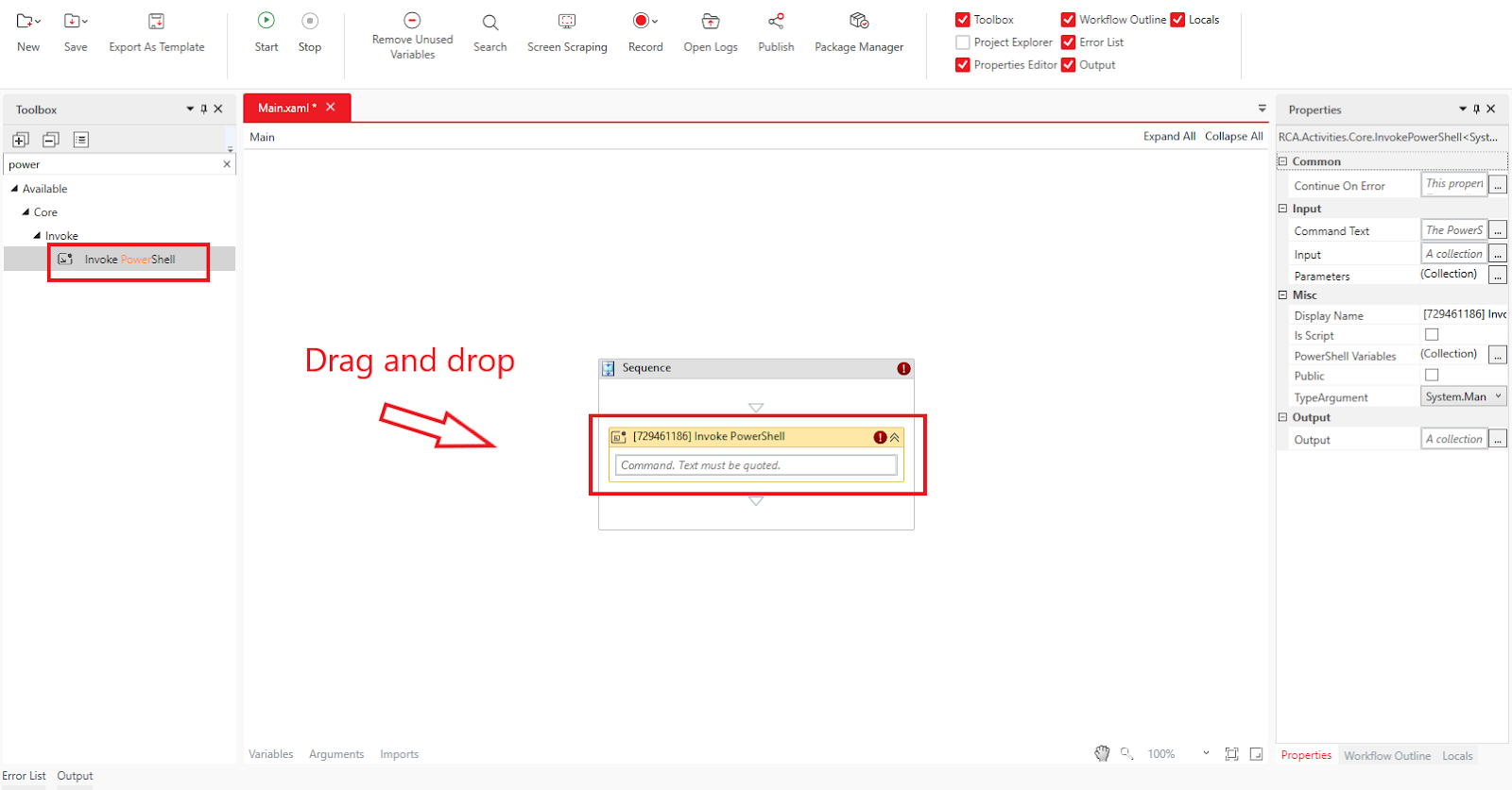 Kéo thả activity "Core" > "Invoke" > "Invoke PowerShell" từ Toolbox vào Designer.