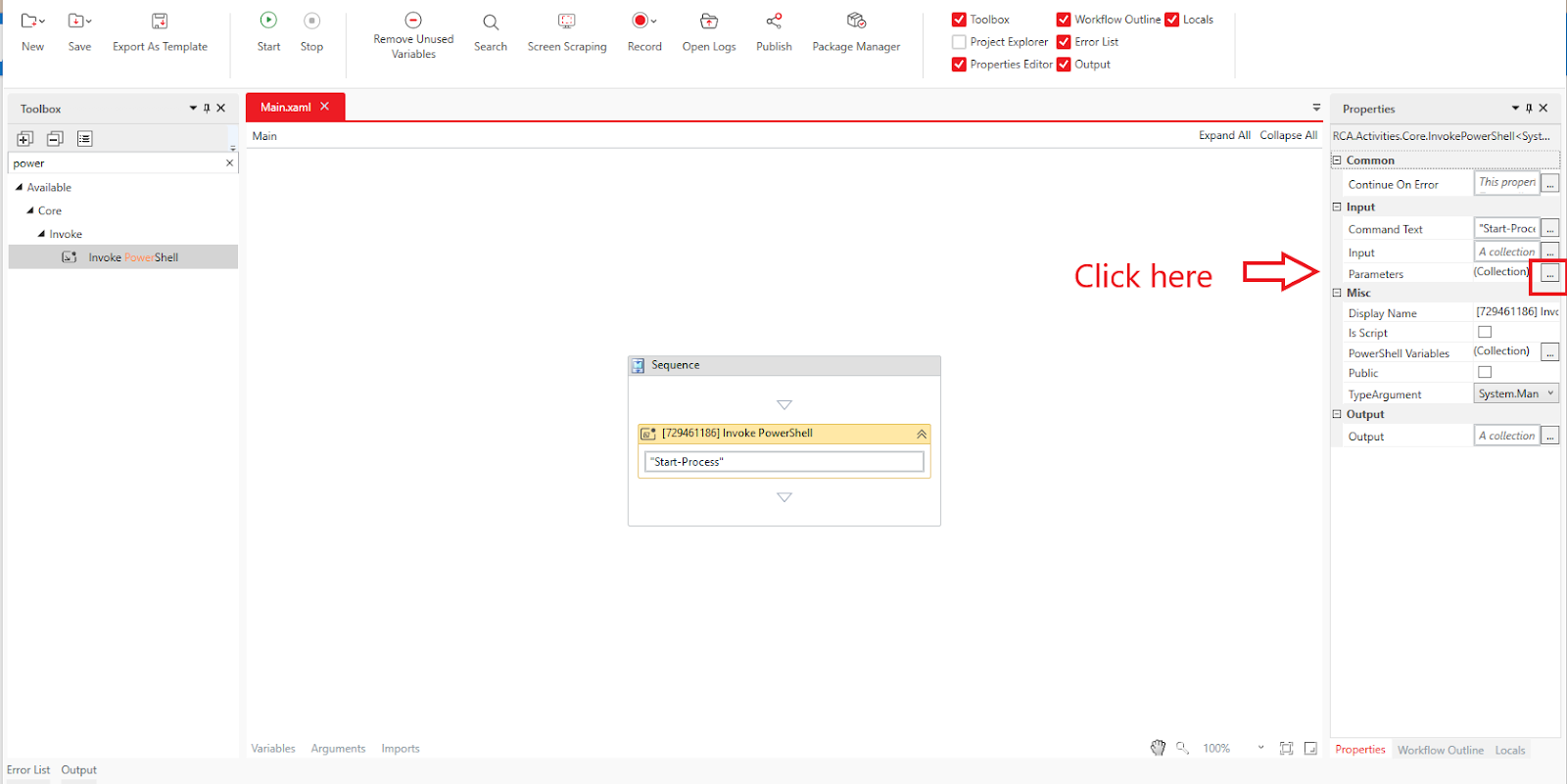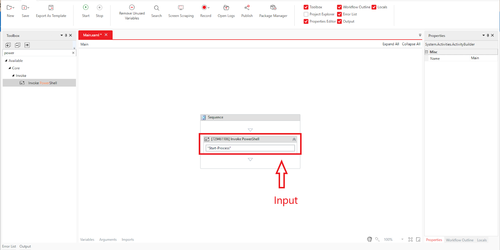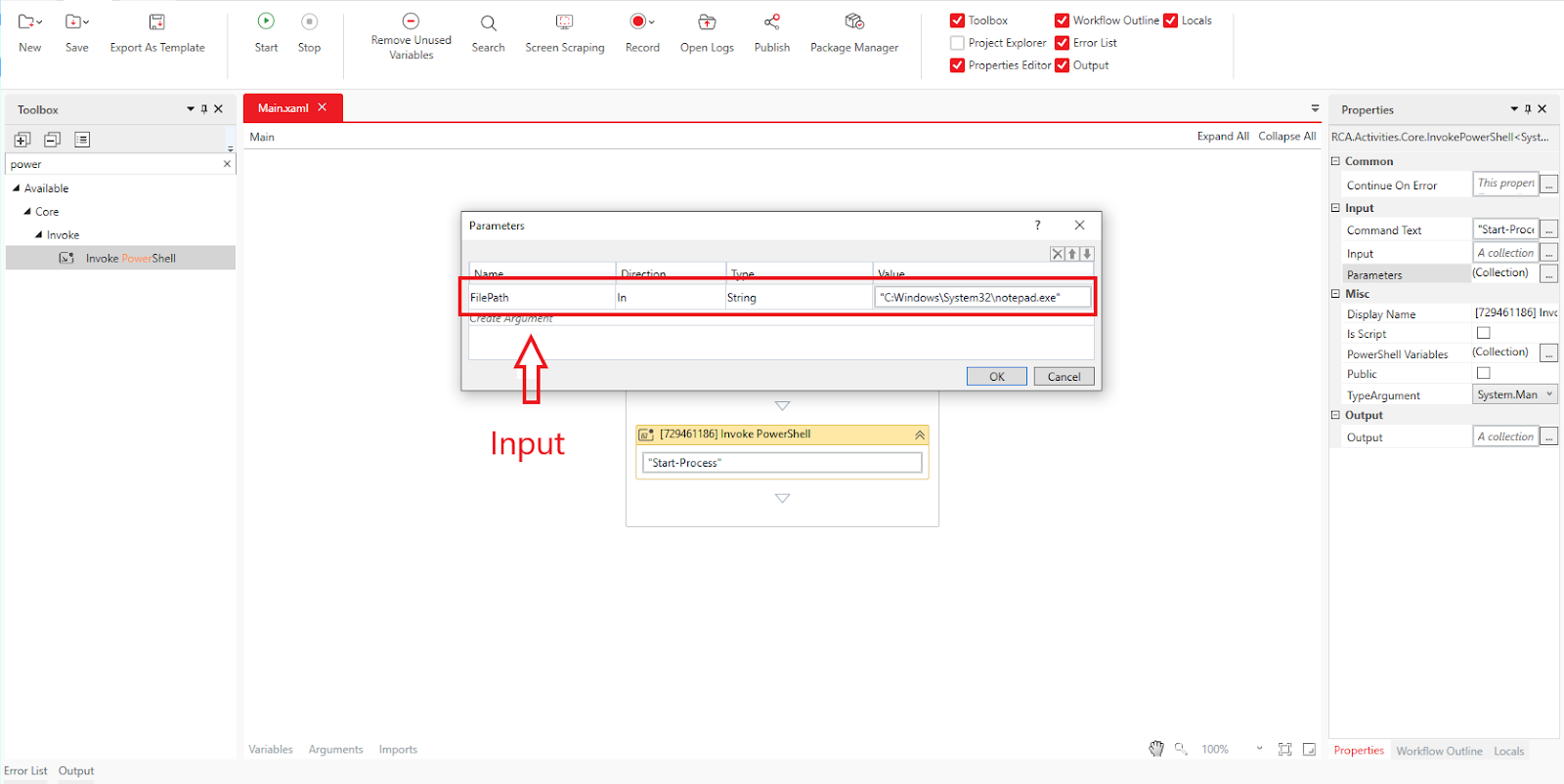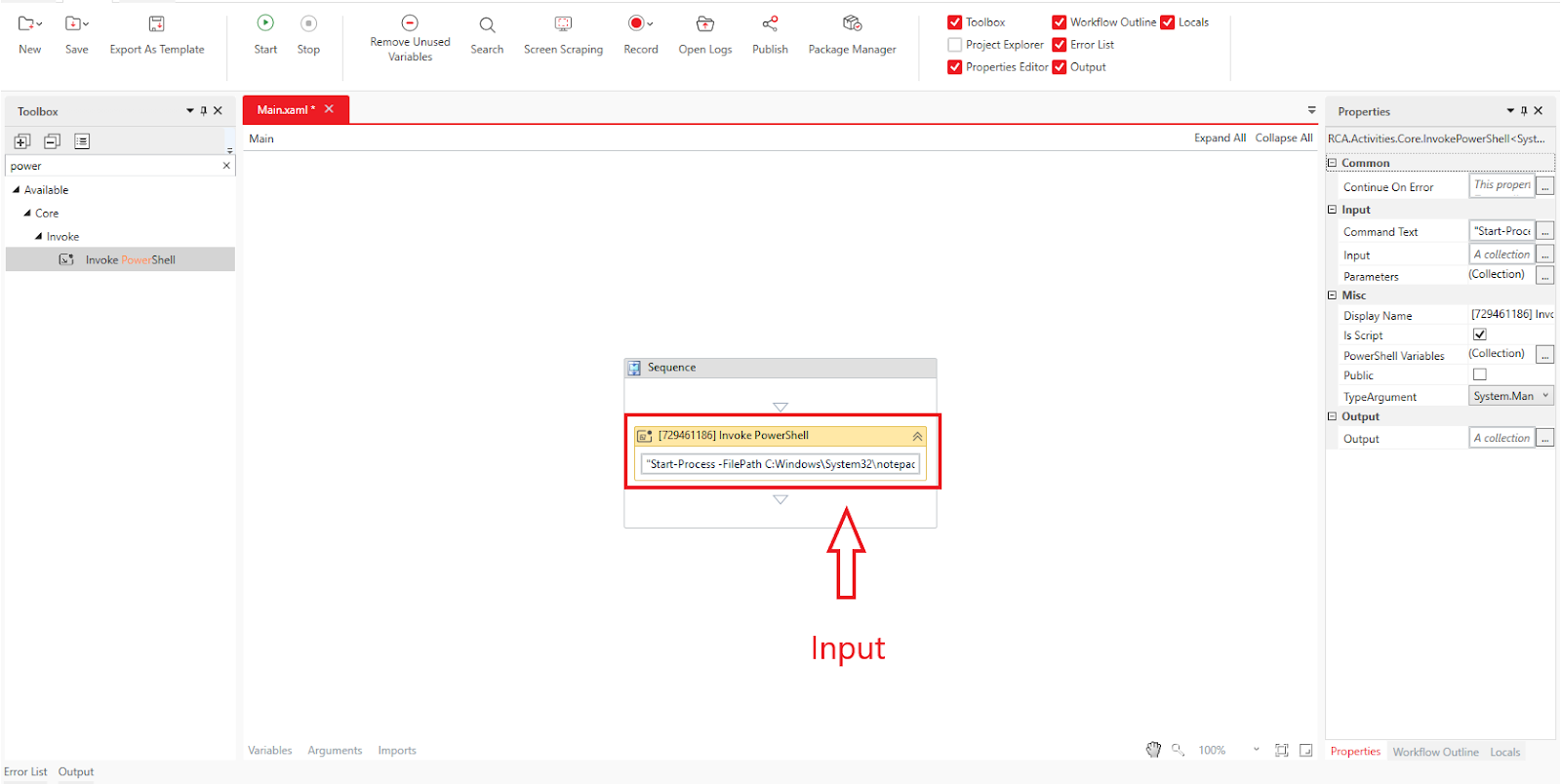 Trong phần này, chúng ta sẽ đi qua cách sử dụng activity "Invoke PowerShell" để mở Notepad.