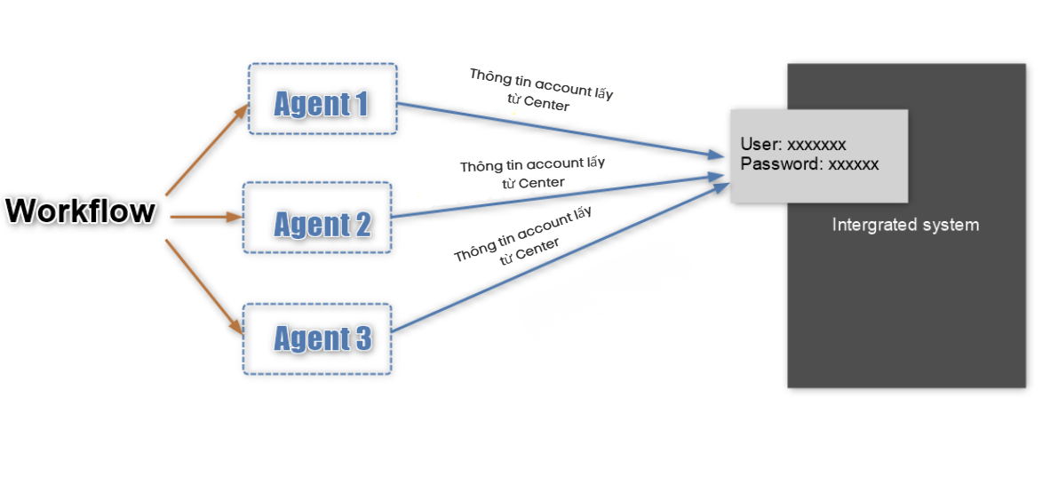Thông thường, thông tin tài khoản đăng nhập thường được “Lưu trong file Excel trên máy cục bộ và đọc bởi Agent,” hoặc “Gắn trực tiếp trong mã code.” Tuy nhiên, cách làm này khiến thông tin dễ bị truy cập bởi bất kỳ ai, gây rủi ro bảo mật, đồng thời khó quản lý tập trung.