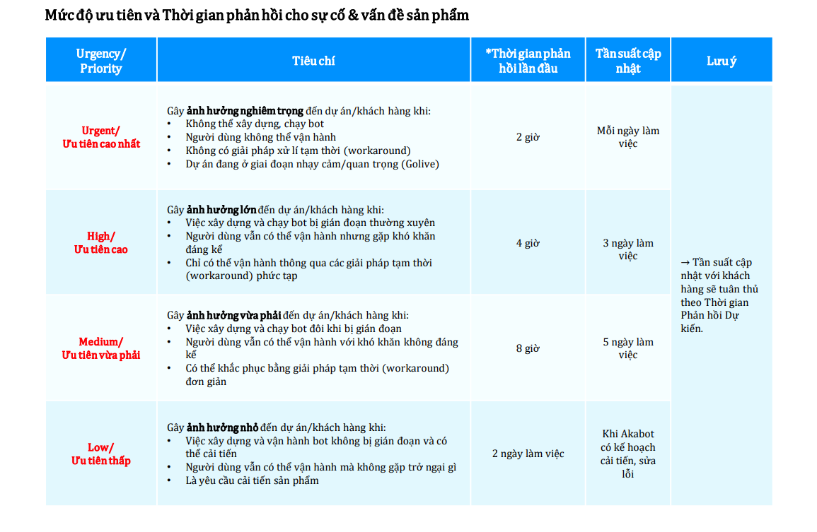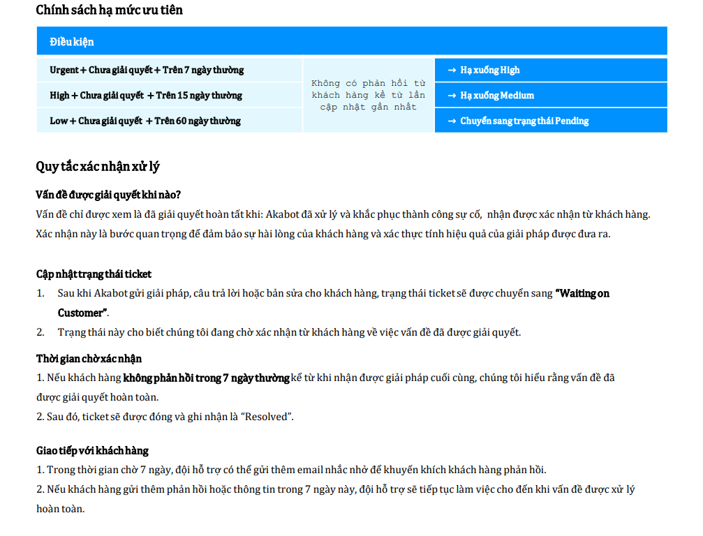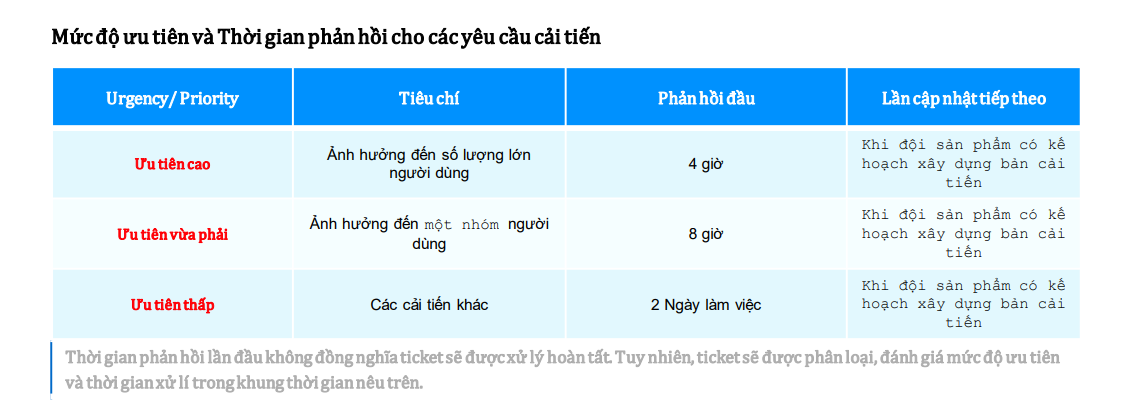 Để đảm bảo việc hỗ trợ kịp thời và hiệu quả, chúng tôi phân loại tất cả các yêu cầu hỗ trợ (ticket) dựa trên mức độ khẩn cấp và gán mức độ ưu tiên tương ứng. Cách làm này giúp đội ngũ hỗ trợ phân bổ nguồn lực hợp lý và xử lý các vấn đề quan trọng nhất trước tiên.