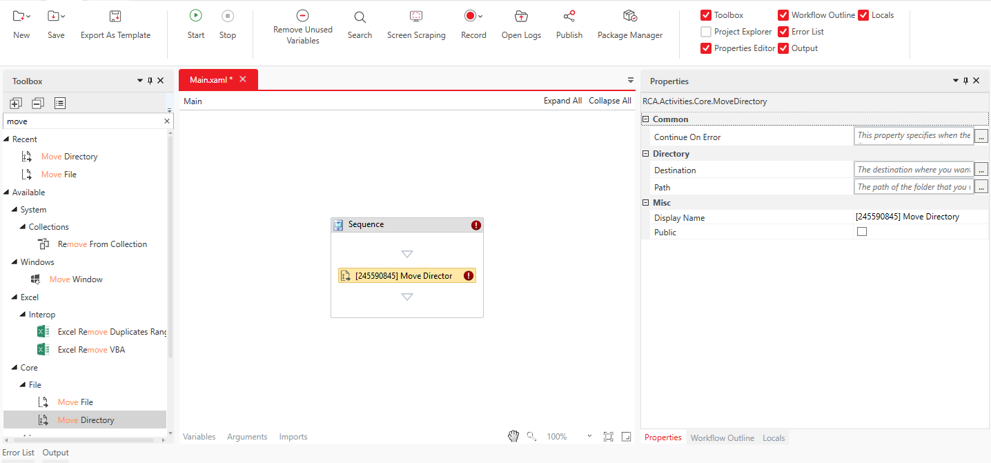 Trong AkaBot Studio, kéo và thả hoạt động " Move Directory " vào workflow vào chuỗi đã được chỉ định. Khi hoạt động này được thêm vào, hãy chỉ định đường dẫn thư mục bạn muốn di chuyển và đường dẫn của thư mục đích.