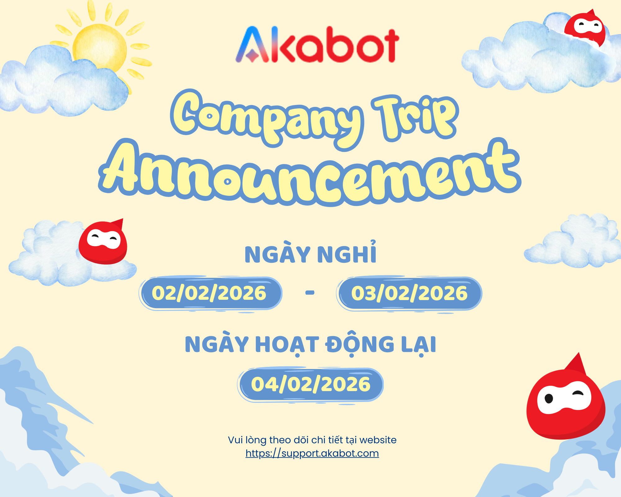 Chúng tôi xin trân trọng thông báo đội ngũ Akabot sẽ tham gia chuyến du lịch công ty từ ngày 02/01/2026 (Thứ Hai) đến hết ngày 03/01/2026 (Thứ Ba).